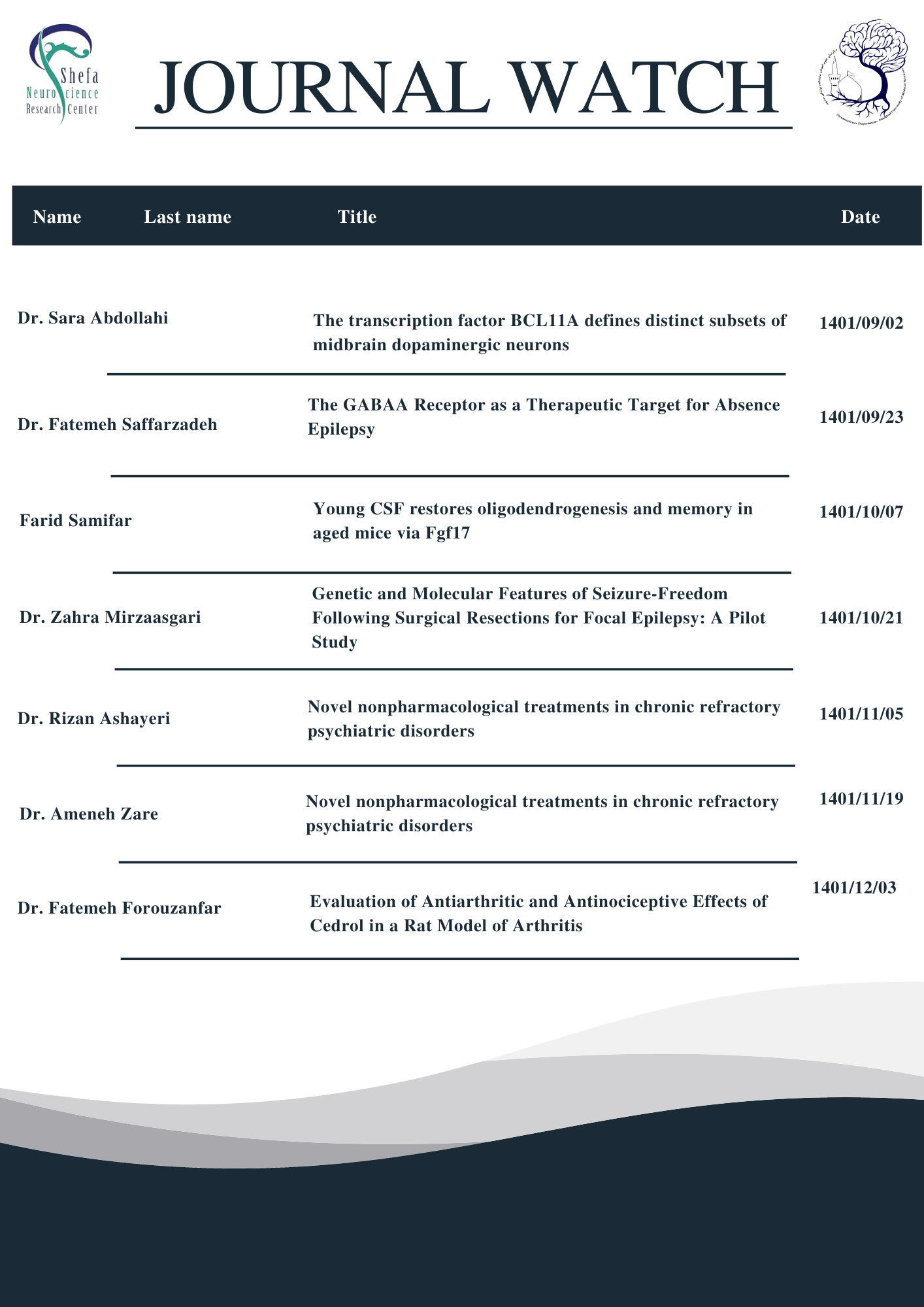 برنامه ژورنال واچ 03 مرداد 1400 24 آبان 1401 بازدید: 507 امتیاز: ( 0 Rating ) امتیاز کاربران لطفا رای دهید رای 1 رای 2 رای 3 رای 4 رای 5 برنامه ژورنال واچ دپارتمان علوم اعصاب – شش ماهه دوم 1401