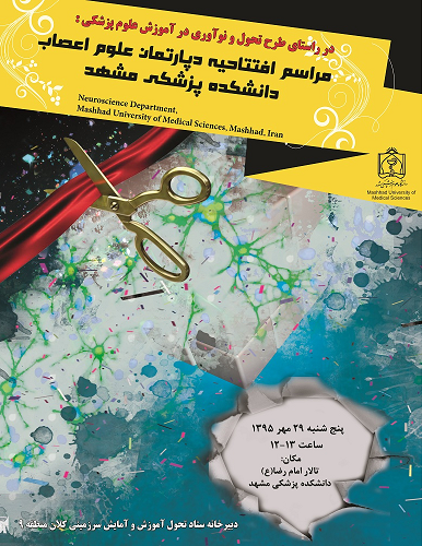 - مراسم افتتاح دپارتمان علوم اعصاب دانشکده پزشکی در روز پنج شنبه مورخ 95/07/29 در تالار امام رضا با حضور جناب آقای دکتر حسینی (معاون وزیر بهداشت)، جناب آقای دکتر مهرابی بهار (رئیس دانشگاه علوم پزشکی مشهد)، جناب آقای دکتر دارابی (معاون آموزشی دانشگاه) و جناب آقای دکتر خویی (رئیس دانشکده پزشکی) و جمعی از اساتید و دانشجویان برگزار گردید.