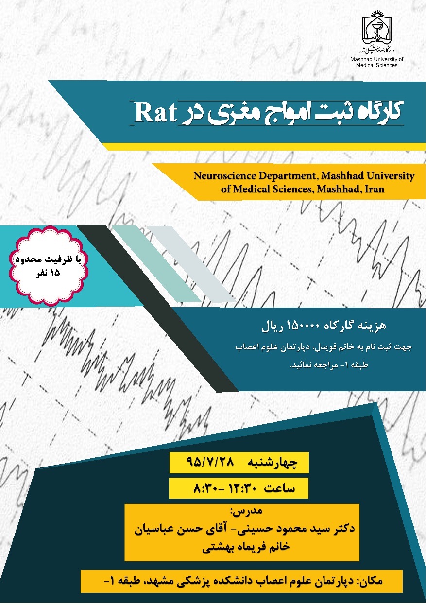 كارگاه ثبت امواج مغزي در Rat در روز چهارشنبه مورخ 28 مهر ماه 1395 از ساعت 8:30 الي 12:30 در دپارتمان علوم اعصاب در دانشکده پزشکی برگزار گردید. مدرسين: جناب آقاي دكتر سيد محمود حسيني، آقاي دکتر حسن عباسيان و خانم فريماه بهشتي