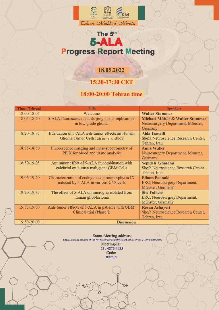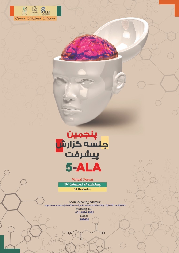 گروه علوم اعصاب دانشگاه علوم پزشکی مشهد با همکاری دانشگاه مونستر آلمان و مرکز تحقیقات علوم اعصاب شفا، پنجمین جلسه گزارش پیشرفت 5ALA را برگزار می نماید.
