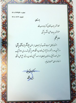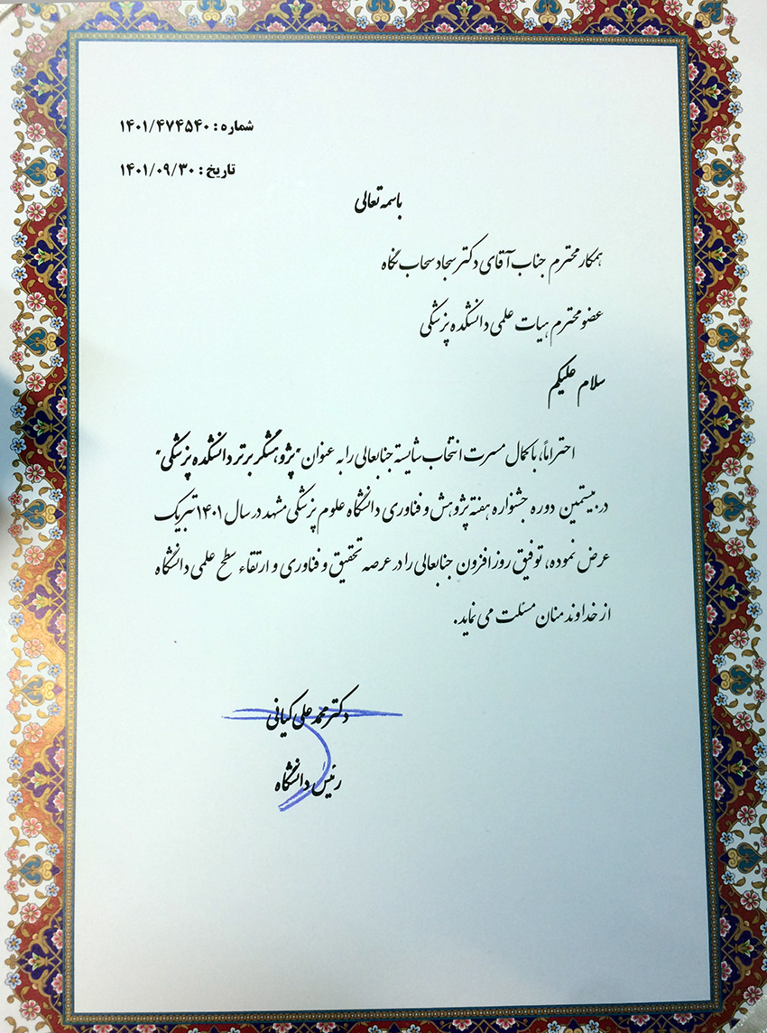 در این مراسم از دکتر سجاد سحابنگاه، عضو هیات علمی گروه علوم اعصاب مشهد به عنوان پژوهشگر برتر دانشگاه علوم پزشکی مشهد تجلیل شد.