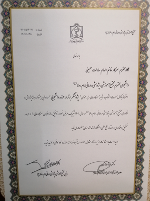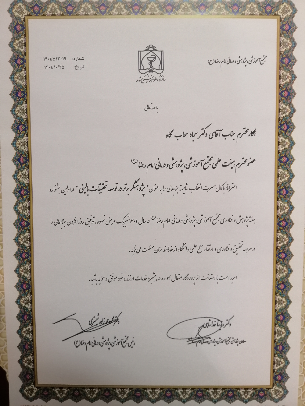 در جشنواره هفته پژوهش و فناوری بیمارستان امام رضا (ع)، دکتر سجاد سحاب نگاه عضو هیات علمی دپارتمان علوم اعصاب و خانم الهام سادات حسینی دانشجوی Ph.D دپارتمان علوم اعصاب به ترتیب به عنوان پژوهشگر برتر در حوزه توسعه تحقیقات بالینی و پژوهشگر برتر در حوزه دانشجویی انتخاب گردیدند.
