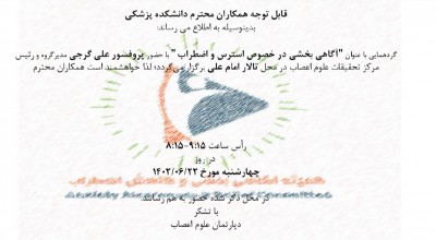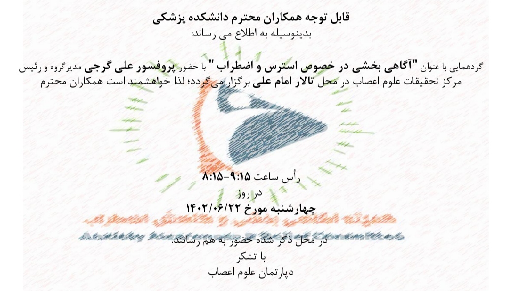 گردهمایی با عنوان آگاهی بخشی در خصوص استرس و اضطراب با حضور پرفسورگرجی مدیر گروه ورئیس مرکزتحقیقات علوم اعصاب در محل تالار امام علی برگزار می گردد