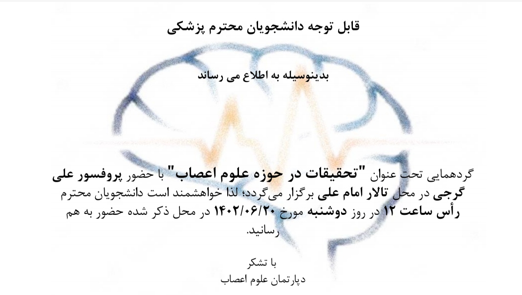 گردهمایی تحت عنوان تحقیقات در علوم اعصاب با حضور پروفسور علی گرجی در محل تالار امام علی برگزار می گرد، لذا خواهشمند است دانشجویان محترم