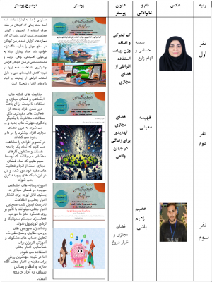 09 تیر 1403 30 تیر 1403 بازدید: 71 امتیاز: ( 0 Rating ) امتیاز کاربران لطفا رای دهید رای 1 رای 2 رای 3 رای 4 رای 5 ضمن تشکر از همه عزیزان شرکت کننده در سمپوزیوم فضای مجازی :تنش و اضطراب اسامی نفرات برتر در بخش پوستر و ایده طبق جدول زیر اعلام می گردد. قبلی بعدی